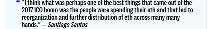 到Bankless的播客,"我认为,2017年ICO热潮中出现的最好的事情之一也许就是人们在消费他们的eth,而这也导致了重组以及eth在许多人手中的进一步分配。"-SantiagoSantos