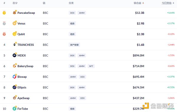 BSC链上DeFi锁定资产前十排名及锁仓量,数据来源:Debank