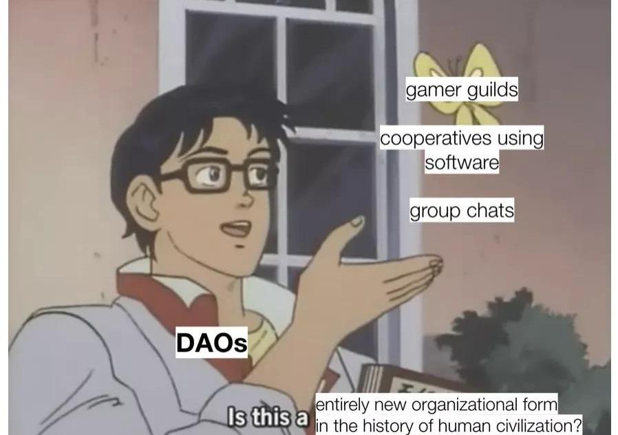 该报告的制度偏见很明显,例如将进步等同于西方自由民主,其对社会进化的叙述充其量也可能看起来是还原性的。然而,它的论点为去中心化组织有意或无意地从中汲取的意识形态提供了历史背景。这在报告对最新组织形式的识别中最为明显:网络。该报告对网络的定义有些开放。网络和它们之前的组织形式之间的一个关键区别特征是,网络被描述为多组织的,强调距离较远的“小型、分散和自治”群体之间的协作。这些团体不一定共享一个独特的组织统一体。虽然网络在历史上一直存在,但新的信息技术强调通过跨越司法管辖区和市场对机构产生巨大影响的合作关系,“促进了keiretsus和其他分布式的、类似网络的全球企业的发展,以及越来越多的所谓‘’虚拟公司”,Ronfeldt指出。然而,多组织网络的主要领域既不是公共部门也不是私营部门,至少在传统上是这样。相反,它们最会改变第三个“自治社会部门”,在报告中被确定为民间社会。在1995年的组织版图中,包括非政府组织(NGO)、草根组织和私人志愿组织,民间社会将通过多组织网络得到加强,并可能解决围绕不平等、官僚主义和先前组织形式失败的可及性问题。报告呈现了网络的甜蜜形象:“虽然制度和市场组织形式的发展导致强调竞争优势,但多组织网络形式的发展可能会将重点转移到合作优势上”。这种表现的背后是非政府组织将在接下来的十年中向全球输出的帝国软实力。对于那些目前在web3上工作的人来说,所有这些语言可能都觉得很熟悉,尽管这种可疑的意识形态继承经常被忽视。由于报告最后强调了民间社会组织、非政府组织、NPO和PCO的三个字母首字母缩略词,因此自然缺少未来的一个:DAO。嵌合术语: