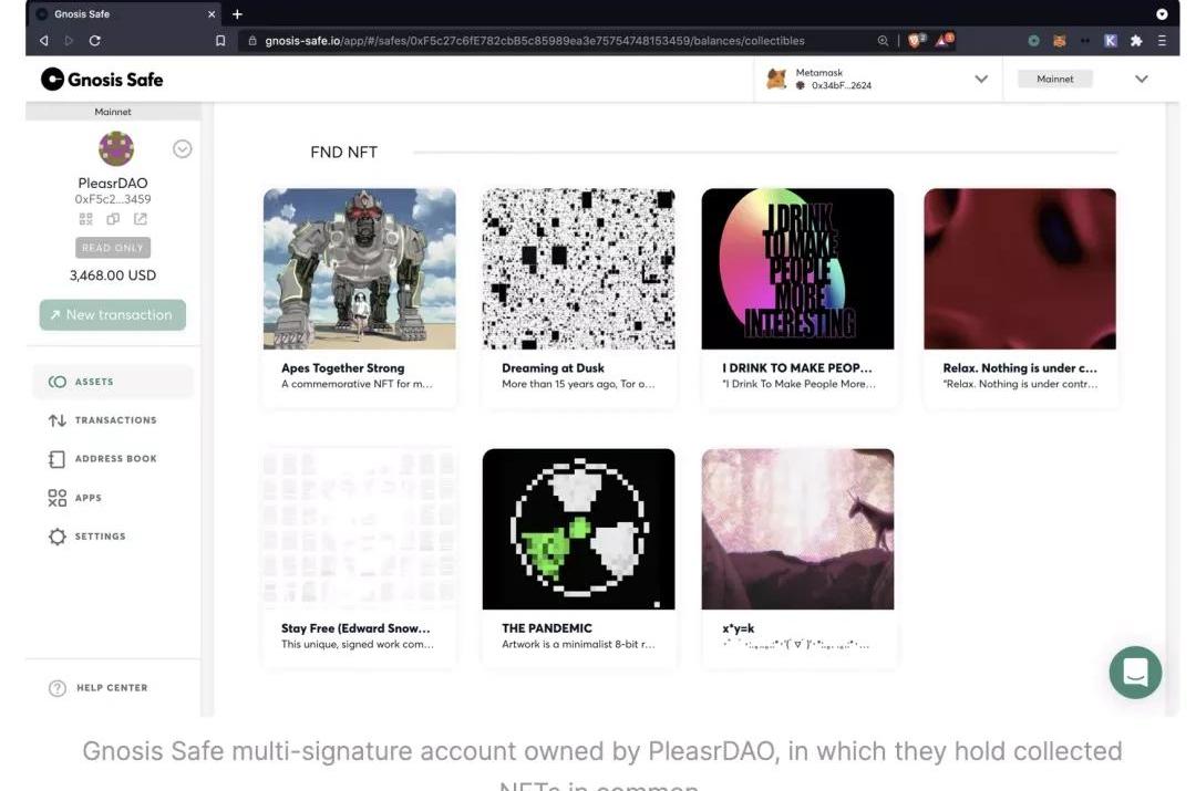 在最简单的形式中,DAO工具被描述为群聊和银行账户(11)。2021年,这通常采用Discord服务器和GnosisSafeMultisig的形式,后者是用于创建多签名帐户的web3平台。多重签名账户允许跨司法管辖区的匿名团体在几分钟内汇集和管理资金,其能力远远超出传统的联合银行账户。这种“最小可行”DAO或MVD工具在2021年上半年通过PleasrDAO等举措大放异彩。PleasrDAO是一个集体竞标艺术家pppleasr的NFT。鉴于NFT数字艺术品拍卖价格不断上涨,PleasrDAO背后的想法很简单:一群使用多重签名账户的粉丝可以汇集资金进行竞拍,并通过共同持有与其他主要竞拍者竞争赢得拍卖。在赢得他们的第一次同名拍卖后,PleasrDAO继续收集其他作品,例如StayFree,爱德华·斯诺登(EdwardSnowden)为独立媒体慈善支持的NFT,当时总计22000ETH或等值540万美元。他们一再成功的任务意味着,在仍然充当收藏家的同时,PleasrDAO将扩大他们的范围,开始由他们的社区孵化项目。像PleasrDAO这样的倡议最有希望通过扩大会员资格来挑战机构收藏家,邀请他们像ppleasr一样收藏的艺术家依次成为集体的成员。