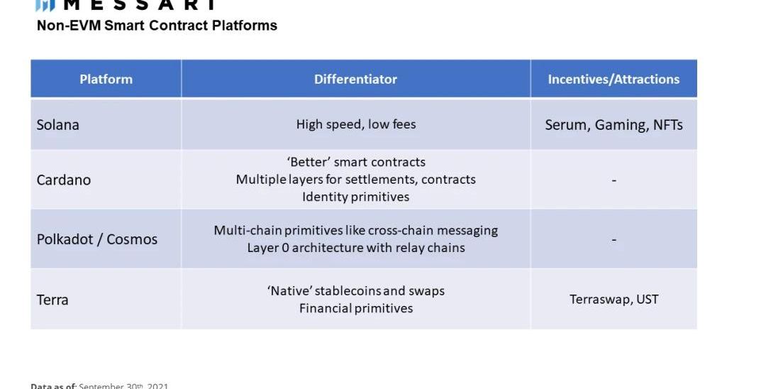 上图:兼容EVM对比不兼容EVM的智能合约平台的优劣势。如上图所示,兼容于EVM的智能合约平台的优劣势分别为:优势:现有的有经验的用户可以迁移过来;继承现有的dApps;技术成熟度更高;更容易与以太坊生态系统实现互操作性,也即所谓的“网络效应”劣势:资本流转很容易,因为资本的转换成本很低;受到以太坊路线图的约束,这可能会干扰你的发布计划;创新受到了EVM规则的约束。相比之下,不兼容EVM的智能合约平台的优劣势如下:优势:可以实现差异化的功能(比如Serum);对既有用户产生“锁住效应”;独立于以太坊路线图;劣势:开发者的进入障碍:需要使用新的语言/框架/开发环境;用户的进入障碍:需要使用新的钱包/接口/应用;需要从零开始增长用户基数;由于处于孤岛式状态,网络效应降低--跨链DeFi可组合性基于上述信息,这给予我们一个潜在的框架来评估最令人兴奋的EVM项目和非EVM项目。EVM宇宙