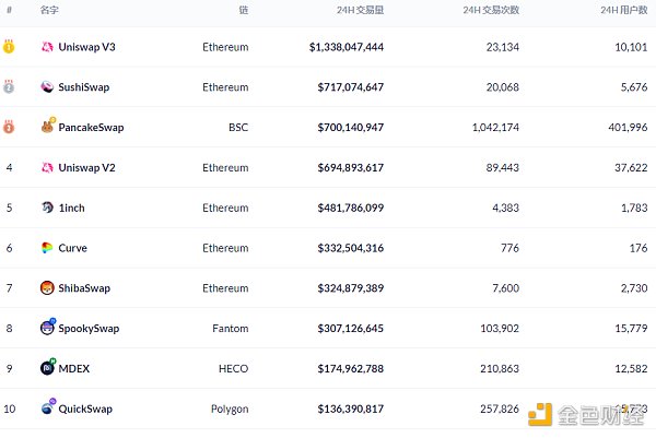 过去24小时去中心化交易所的交易量数据来源:Debank