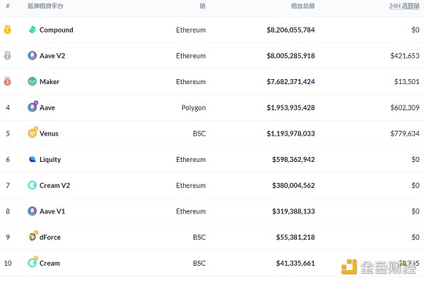 DeFi项目锁定资产前十排名及锁仓量,数据来源:Debank