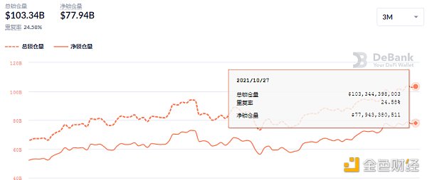 Ethereum链上DeFi锁定资产前十排名及锁仓量,数据来源:Debank