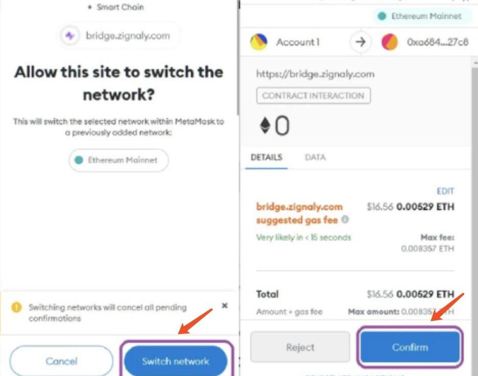 选择Metamask第六步:批准Metamask/Bridge使用ZIG的权限:ERC20和BSC网络会一次性设置成本,因此钱包需要分别有足够的ETH和BNB来支付gas费用。ERC20——确保你在以太坊主网上: