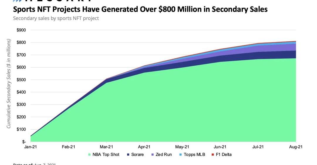 虽然NFT是在Layer1或Layer2级别创建和传输的,但应用层是发行这些代币的一个潜在接口。随着个体进入会议、艺术画廊、和即将到来的用例的世界,像Decentraland和Cryptovoxels这样的虚拟世界随着时间的推移慢慢增长。梦幻体育等其他应用经历了疯狂的投机,但仍在不断增加新用户。迄今为止,基于加密的体育应用取得了令人难以置信的成功。NFT体育应用已经产生了超过8亿美元的二级销售额,如果考虑到初级销售额,则可能超过10亿美元。