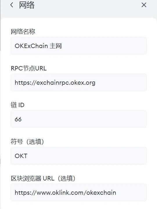 在弹出的表单中输入下列信息:网络名称:OECMainnet新增RPCURL:https://exchainrpc.okex.org链ID:66符号:OKT区块链浏览器URL:https://www.oklink.com/OEC/