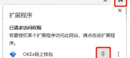 为了方便使用,我们可以点击地址栏旁边的扩展程序按钮,并将OKEx链上钱包固定。