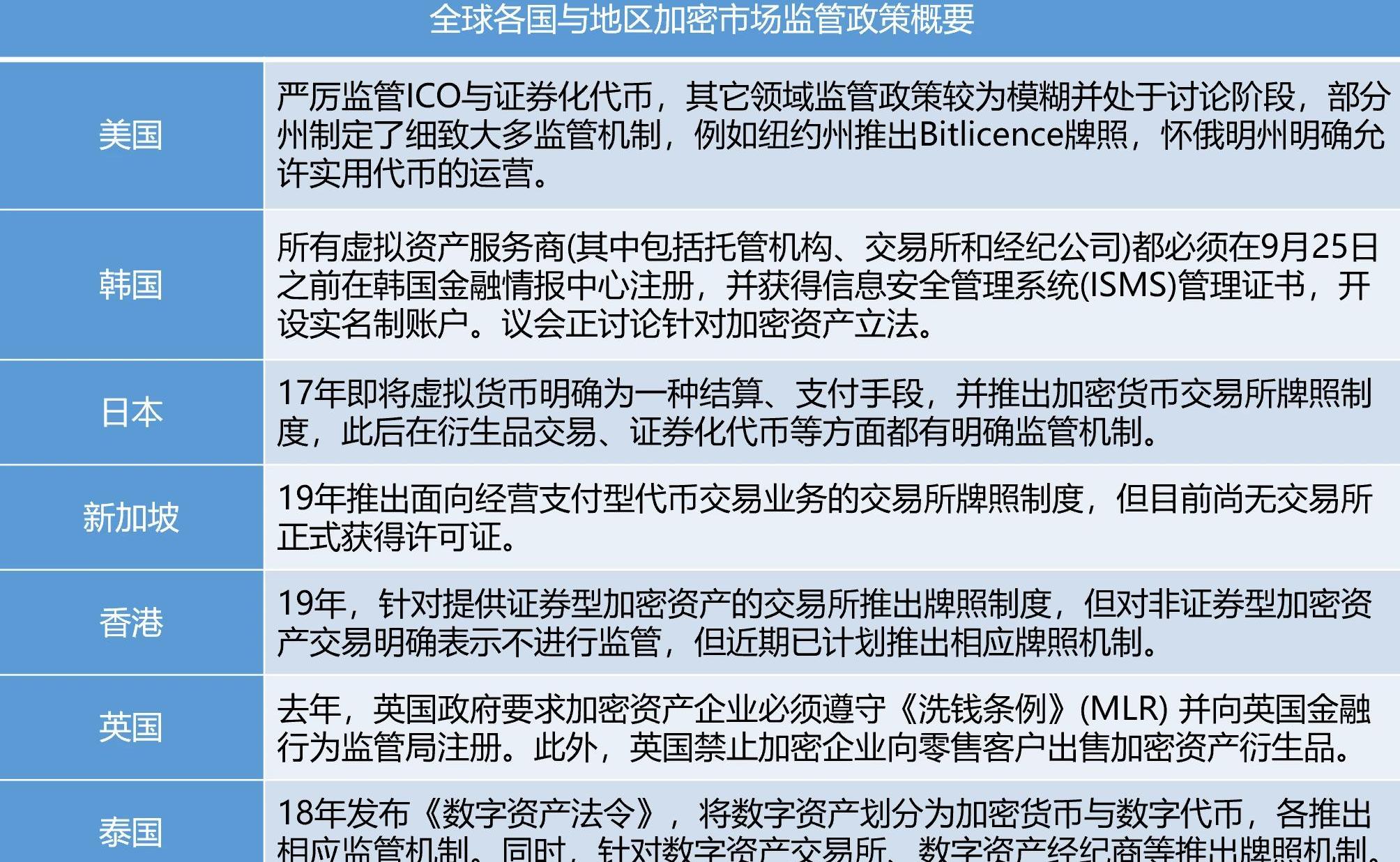 根据金融行动特别工作组(FATF)今年7月发布的数据,目前128个司法管辖区中有58个表示已经实施了修订后的FATF标准,其中52个司法管辖区监管虚拟资产服务提供商,6个司法管辖区禁止虚拟资产服务提供商的运营。近期,多国政府向部分加密货币交易所发出警告,主要原因是提供衍生品交易以及未在本国注册,也反映出越来越多国家不再对加密货币交易保持放任状态,开始主动出击。目前起来,加密资产在全球金融市场扮演越来越重要的角色,因而越来越多国家正在制定相应监管机制,不过目前多数国家主要基于反与反恐融资风险的防御性目的进行相应监管,而不是处于推动行业进步的主要目的进行监管。在部分具有明确监管机制的国家中,通常会明确将加密资产划分为不同类型的代币,例如划分为实用代币、支付代币与证券型代币,并要求证券型代币按照证券法的相关要求进行管理,其它类型的代币则较少监管。延伸阅读:多国调整加密货币法律框架此外,日本、新加坡、韩国、英国、德国以及美国纽约州等地针对加密企业推出牌照制度,其中以新加坡、香港、日本等亚洲地区最为友好,吸引许多加密企业在当地建立业务甚至迁移总部,成为目前加密市场的中心地带。随着DeFi、NFT等新事物的快速发展,全球各国与地区面临的加密市场监管问题也愈发复杂,如何处理市场创新包容性与金融稳定风险的平衡问题,将尤其考验各国政府的治理能力与战略视野。