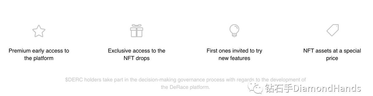 赛马竞技场3-通证经济:ZEDRUN并没有相关的通证,而DeRace一开始就设计了自己通证DERC的经济模型,游戏中的下注、交易等也全都通过DERC进行。而持有DERC的人,也将有机会提前体验游戏、提前购买NFT资产等。