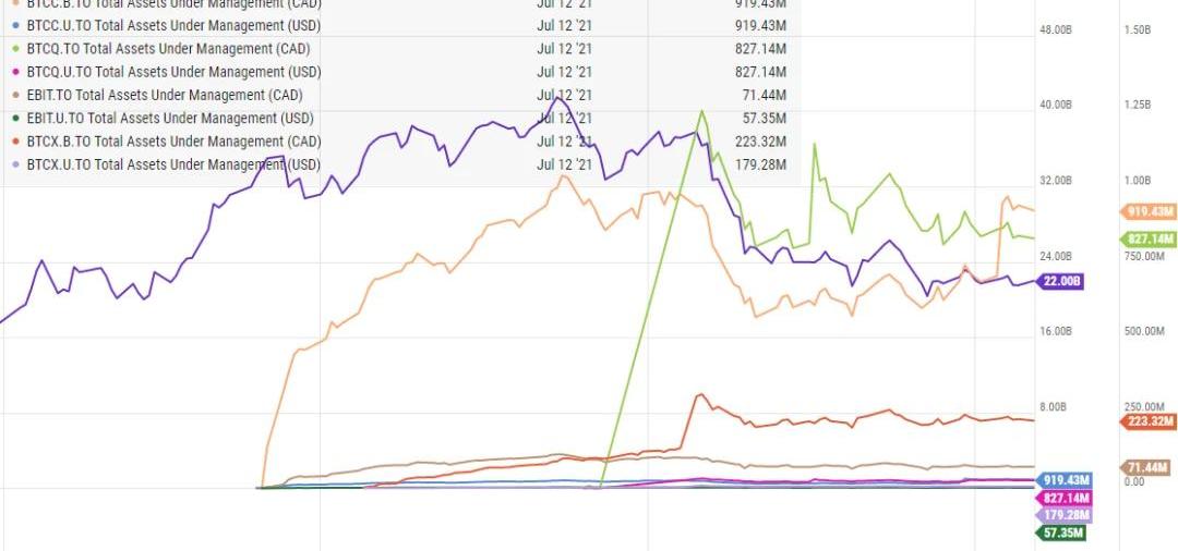 图3.MarketCap&ListedSharesOutstanding数据来源:TSXIDEG整理加拿大比特币ETF中,PurposeBitcoinETF作为北美首个比特币ETF,发行仅两天市值就达到了3.33亿美元,吸引了大量流动性。但3iQCoinshares随后推出的BTCQ和BTCQ.U目前在市值、份额和AUM方面都反超了Purpose。3iQCoinshares的BTCQ是AUM最快到达10亿美元的,仅在发行后三周内迅速达到顶峰。可能是由于其是第一家提供公共比特币投资基金TheBitcoinFund(TSX:QBTC)和公共以太投资基金TheEtherFund(TSX:QETH.UN)的数字资产投资基金管理公司。一方面拥有一定的客户基础和行业认可度,另一方面它还允许客户将QBTC转换成3iQCoinShares比特币ETF。相较于封闭式基金更为灵活也从灰度GBTC那赢得了部分风险敞口。