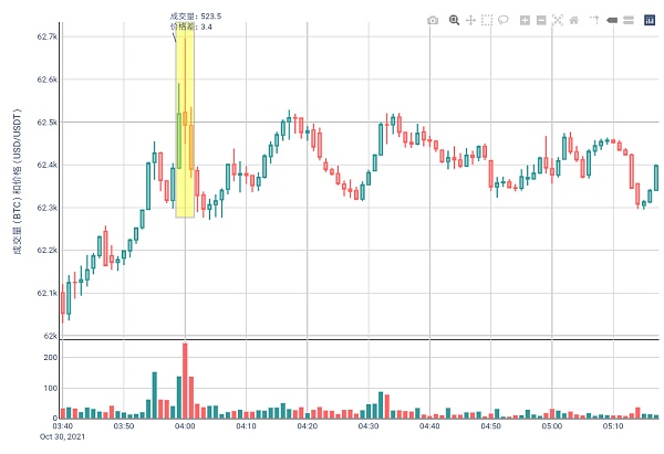 上图所示的波动较为剧烈的行情发生在北京时间2021.11.4 2:00(UTC时间18:00),某交易所的比特币永续期货合约出现近2000美元的价格波动,当时4家交易所的现货成交总量约为2682.6个币。尽管这可理解为市场对美联储于该时间点公布11月货币政策委员会决议所带来的影响——美联储在维持政策利率不变的情况下,如市场预期般正式启动Taper的进程,将每月减少150亿美元的债券购买速度,但诸如此类的行情在没有相关新闻时也是不少见的。而在类似的行情中将难以在预期价格执行交易指令,不管是下单、建仓、平仓都存在不可控的巨大风险。因此,对于重要的策略,我们期望能在较平稳的行情中执行。