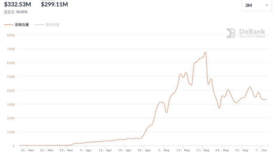 总锁仓量的增长势态是判断链上生态发展趋势的最佳标准,然而,经历了519黑天鹅事件,加密市场受挫严重,几乎所有生态的TVL都出现了不同幅度的下降,再去谈增长态势已不太现实。因此,我们选择的第一个对比维度将是不同生态的TVL波动状况,具体来说,是看某一生态当前的TVL数据较历史高点的下滑幅度。1.Polygon先来看看Polygon,考虑到不同数据聚合平台之间也会存在细节差异,因此在选择数据源时,Polygon、BSC、Fantom均将采用DeBank的数据。