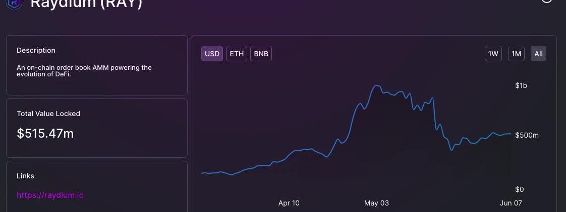 从趋势上看,与Polygon整体状况类似,Aave的该链版本基本也保持着正向的资金流入趋势。数据显示,Aave当前的总锁仓量为35.6亿美元,占据了整个Polygon链上TVL的逾半壁江山,总用户数为25025人,24小时用户数为1003人,24小时合约交互数为142581次。2.SolanaSolana生态内的龙头DeFi也不难猜——Raydium。DefiLlama数据显示,Raydium当前的锁仓量为5.15亿美元,虽然也占据了整条Solana生态TVL的过半比例,但较5月3日的历史高点9.6亿美元已近乎腰斩。