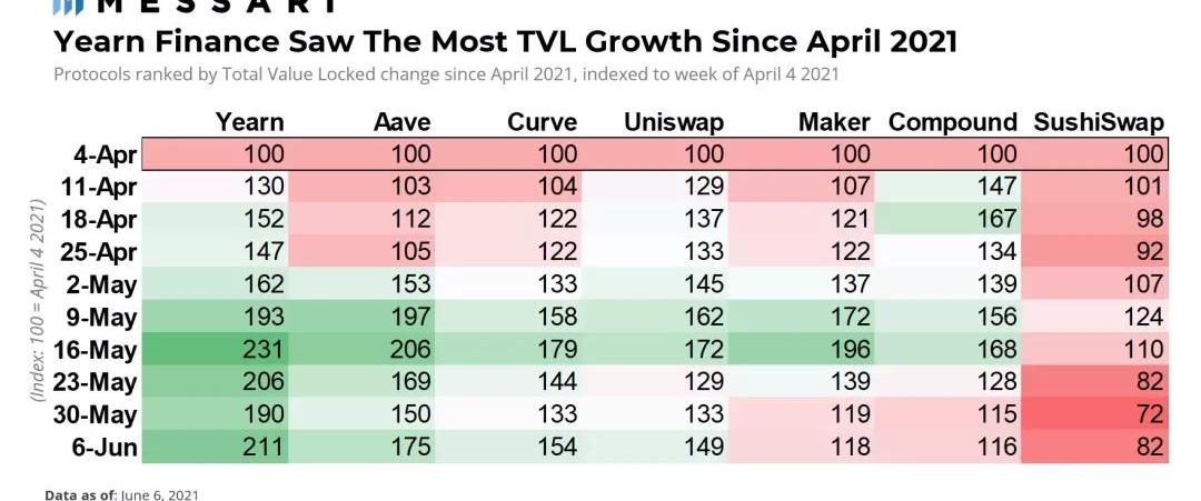 锁定的总价值是跟踪协议提取价值能力的一个重要指标。下表显示了从4月开始的每周的TVL数据,按资本的增长进行排名。自4月初以来,所有协议都有所增长,YearnFinance的增长幅度最大,其次是Aave。相对而言,SushiSwap表现不佳。它的TVL已经收缩了-18%,从底部看,第二位的Compound增长最少,只有+16%。