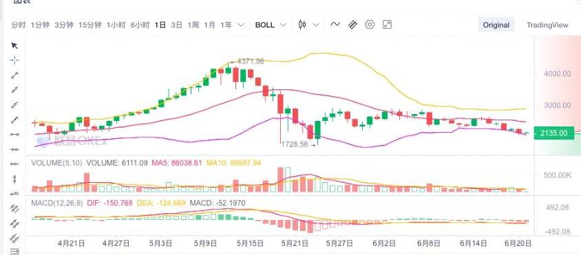 1.现货市场OKEx行情数据显示,上周ETH价格震荡下行,周内收于2111美元,环比下跌18%。