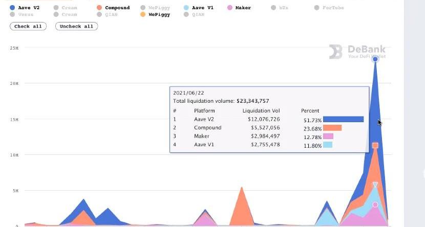 6月22日,比特币再次跌破3万美元大关,24小时跌幅超11%,一周内跌去1万刀。据不完全统计,过去24小时,DeFi协议中有超过2500万美元被清算,是前一天的7倍之多。