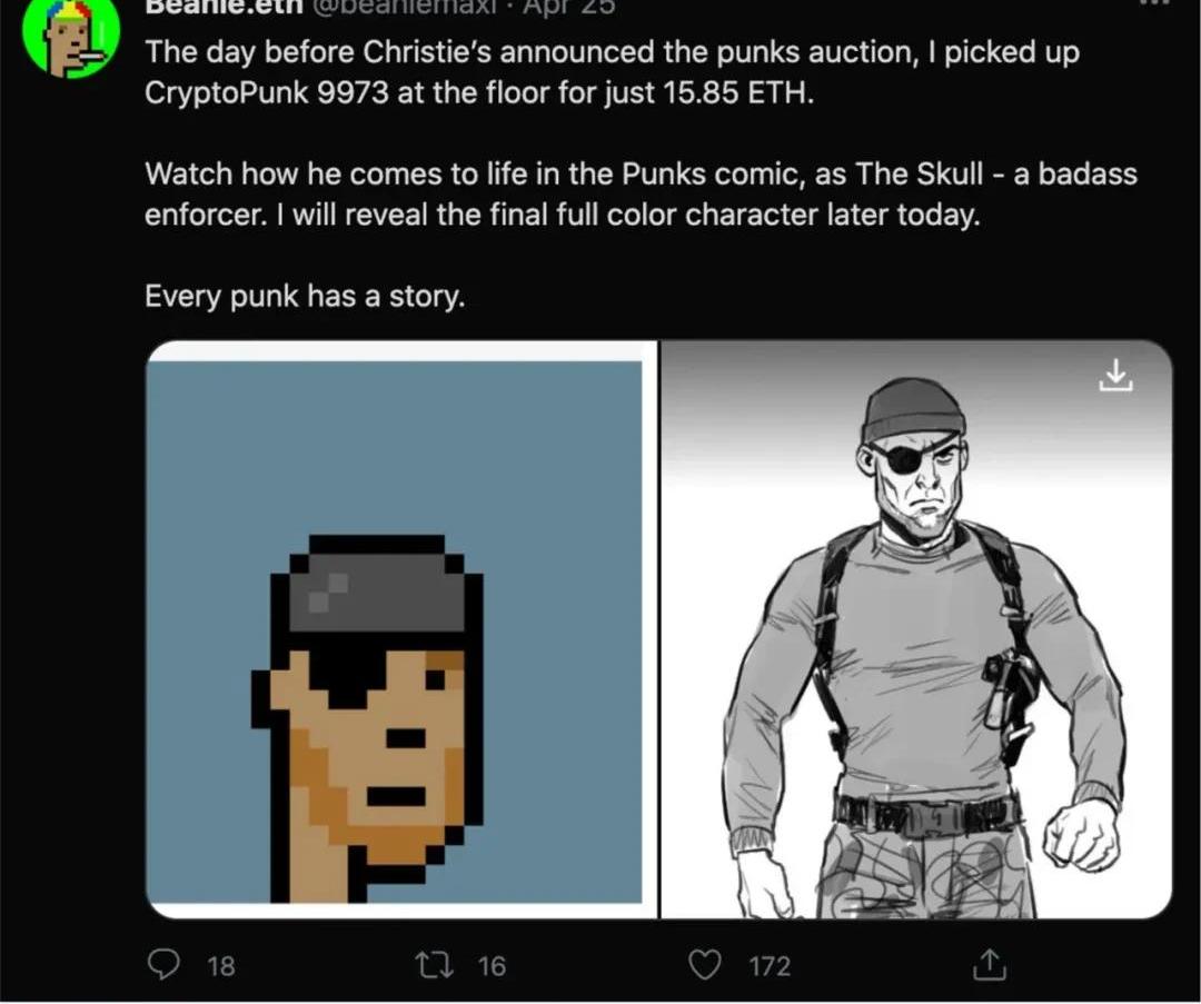 目前至少有两条路径可以围绕角色构建社区,在其IP上进行创新,围绕角色创建数字身份,并从IP的市场成功中获得经济收益。未来几年肯定会涌现出更多路径,不过我会使用当前范例来演示每个模型。CryptoPunksCryptoPunks展示了开发者LarvaLabs为10,000个角色创建数字艺术品的一种途径,其中每个角色都作为具有独特属性的NFT存在。围绕CryptoPunkNFT所开发产品形成一个去中心化收藏家社区,该社区拥有自己的文化行为和规范,例如使用CryptoPunk作为各个社交媒体平台的个人资料头像图片。尽管CryptoPunks最初于2017年免费发布,但在社区引导下,该项目产品的终身销售额已超过6.8亿美元。不过,收藏家们不仅是被动地持有CryptoPunk,还开始相互合作,创作由CryptoPunk角色艺术启发出的新故事,使他们的CryptoPunk「拥有生命」。NFT艺术就像一个数字乐高积木,或者一种具有创造性的干细胞——无论哪种方式,都为丰富的想象力提供了向各个方向、以各种方式发展的基础。例如,一群收藏家创作了一部包含16位朋克人物的PUNKS漫画,并附有背景故事和叙事线,将为这些朋克创造完整的IP身份。