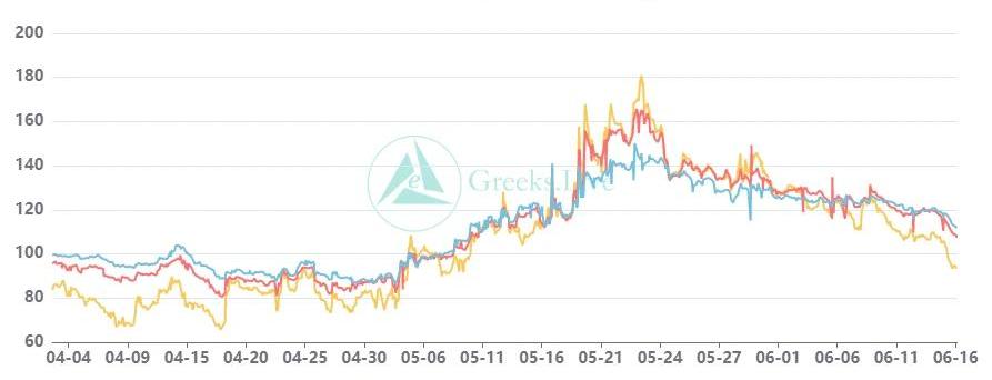 以太坊期权成交量1.2亿美元,持仓量37亿美元。10d85%30d192%90d132%1Y105%各标准化期限IV:今日:1m110%,3m116%,6m118%6/14:1m93%,3m109%,6m113%以太坊不论是成交量还是价格波动都明显弱于比特币,DeFi的低迷是主要原因。短期IV下降比较明显,目前已经接近4月水平,中远期IV并不低,仍然高于4月。