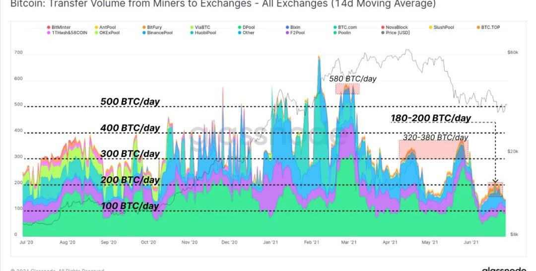 矿工钱包的比特币数量变化那么,矿工是否正在清算其比特币库存以支付重新安置矿机所产生的风险和成本?从矿工钱包中持有的总余额可以看出,自1月27日的低点以来,矿工总共囤积了超过1万枚比特币,占到这段时间内挖出的比特币数量的7.6%,同时也表明矿工在此期间出售了其92.4%的比特币。今年6月初,矿工减持了7000枚比特币,这很可能是矿工清算库存以准备迁移矿机造成的。我们还可以跟踪矿工向交易所发送比特币的情况,用14天移动平均线来平滑与难度调整同时期的数据,以评估矿工的相对抛售压力。