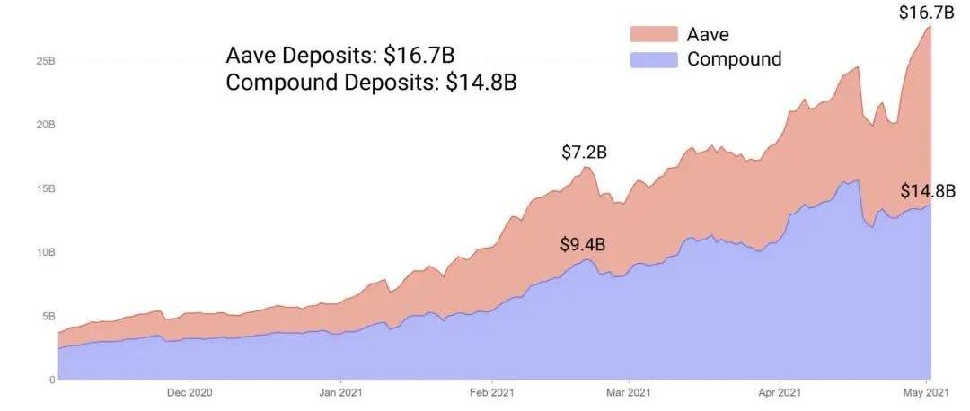 Aave和Compound是DeFi最大的借贷协议。直到最近,就存款总额而言,Compound一直是最大的借贷协议。而Aave通过其新的流动性激励措施扭转了这一局面,目前其在借贷中占据了流动性的主导地位。