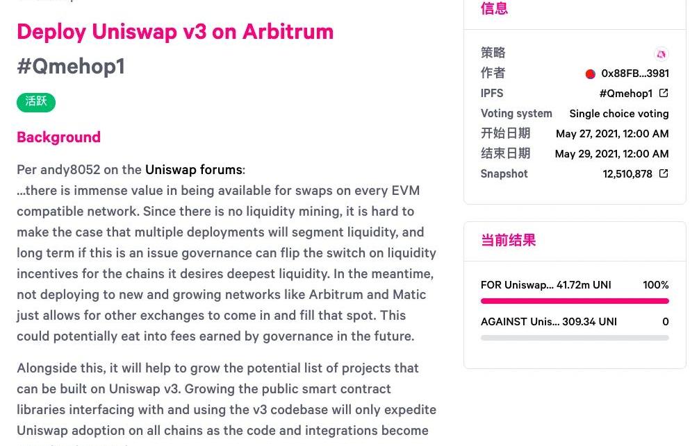 不过,随着一项民意调查的启动,该讨论终于有了结果。5月27日,Compound创始人RobertLeshner发起了一项主题为“是否应该将UniswapV3部署至Arbitrum”的民意调查投票,截止发文,该投票已经获得了压倒性的民意支持。在社区相关主题的讨论贴内,几乎所有留言都在表态支持,点赞最高的一条留言指出了部署至Arbitrum的两大必要性:没人知道Optimism和Arbitrum谁更具吸引力,如果Uniswap决定只部署至Optimism,最后Arbitrum成为了最受欢迎的Rollup,那就便宜了竞争对手。Arbitrum即将上线主网,Optimism还得等到猴年马月,将V3部署至Arbitrum将在短时间内解决Uniswap的高gas费用问题,团队还不需要更改任何合约。不过,考虑到Uniswap的治理流程,严格意义上讲,目前民意调查阶段的票数优势并不意味着最终Uniswap一定能够部署至Arbitrum,但怎么说也是大概率事件了。值得一提的是,想得更远的社区成员也提起了另一个猜测,Uniswap是否会在Arbitrum上重启UNI代币的流动性挖矿。今日早间,Uniswap创始人HaydenAdams在Coindesk共识大会上提到“Uniswap将很快重启通用型流动性挖矿”,这句话被一些读者误以为是Uniswap将重启UNI代币的流动性挖矿,但事实并非如此。HaydenAdams说的是UniswapV3版通用型流动性挖矿智能合约即将发布,即支持其他项目在Uniswap的创建流动性激励,而不是说启动UNI代币本身的流动性挖矿。不过,考虑到Uniswap会在二层面临全新的竞争环境,届时为了抢占市场份额而在Layer2启动全新的UNI流动性挖矿也并非毫无可能。