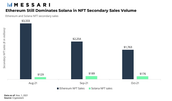值得注意的是,以太坊在 NFT 二级销售总量上仍然让 Solana 相形见绌,在过去三个月中的每一个月都记录了一个数量级的交易量。