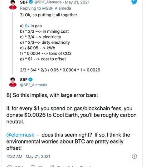 SBF表示,根据CoolEarth计算,大约1块美金可以减低1吨的碳排放。结算:平衡挖矿碳排仅需低成本SBF最后对他的计算做推论,GasFee花了X元,有2/3会花在挖矿成本,3/4花在电力,其中有2/3是非再生能源,成本约0.05美元/kWh,每kWh产生0.0004吨的二氧化碳,每吨要花1美元来减少碳排放。2/3*3/4*(2/3)/0.05*0.0004*1=0.0026SBF表示,这个结果告诉我们,如果你在手续费上面花费1块美金,你只要捐给CoolEarth0.0026美元,就能解决碳排放问题。他同时标注,批评比特币造成碳排放负担的特斯拉创办人马斯克。