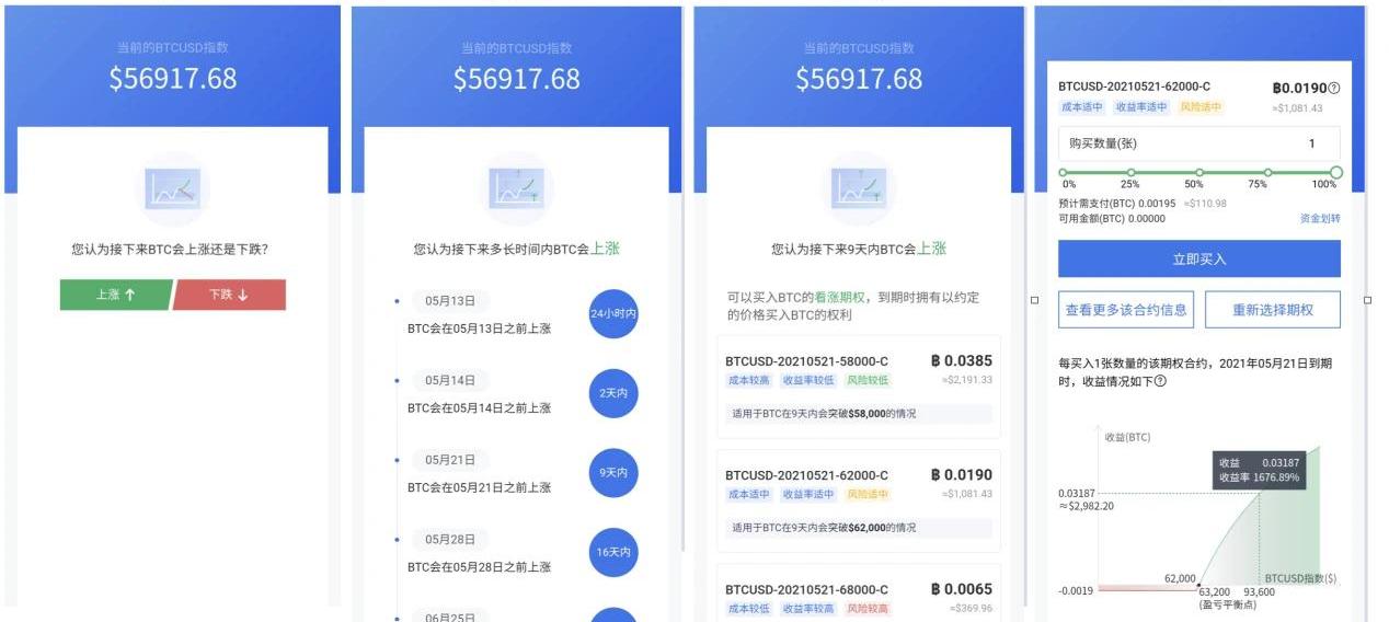 (经典账户下的期权简选)此次期权简选上线统一账户,并不是简单的迁移,而是一次功能升级:选期权流程进一步简化,步骤从四步变为两步,操作门槛大大降低,同时系统提供不同的组合选项,让想交易期权但无从下手的用户也可以如同买卖币一样买卖期权。