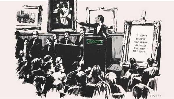 英国著名街头艺术家班克斯为了讽刺拍卖行炒作艺术品的行为,曾专门创作过一幅名叫《白痴》的版画。在他的这幅画里,以为拍卖师正在口若悬河,煽动台下的收藏家出价,而正在兜售的作品只是一个空空的相框,上面写着:我真不敢相信 你们这群白痴买下了这个东西。