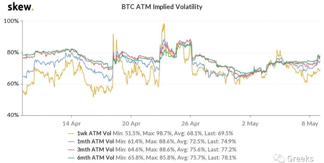 播报数据由Greeks.live和Skew.com提供。距离以太坊突破3000美元大关还不到一周,现在以太坊已经开始冲击4000美元了,两周时间上涨了60%。以太坊买入看涨期权成交55000张,加上大宗成交占据了昨日一半交易量,多方正在进攻。期权成交量5.36亿美元,期权持仓量为100亿美元。10d84%30d74%90d80%1Y68%各标准化期限隐含波动率:今日:1m74%,3m77%,6m78%,DVol84%5/8:1m67%,3m71%,6m73%,DVol78%比特币在以太坊的带动下,上涨至59000美元附近,目前全期限IV高于近期平均水平。比特币期权现在成交量已经基本被以太坊追平,持仓量已经不到2倍,看趋势被以太坊赶超可能就在近几个月。