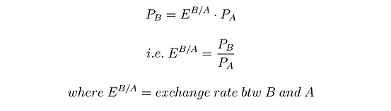 假设任何两个经济体的商品产出都是可替代的,因此商品的价格差异可以被套利到一致(这在很多情况下显然不是真实情况,但只要大方向正确,就不会影响我们的推演目的),A国和B国的价格水平之间的关系是: