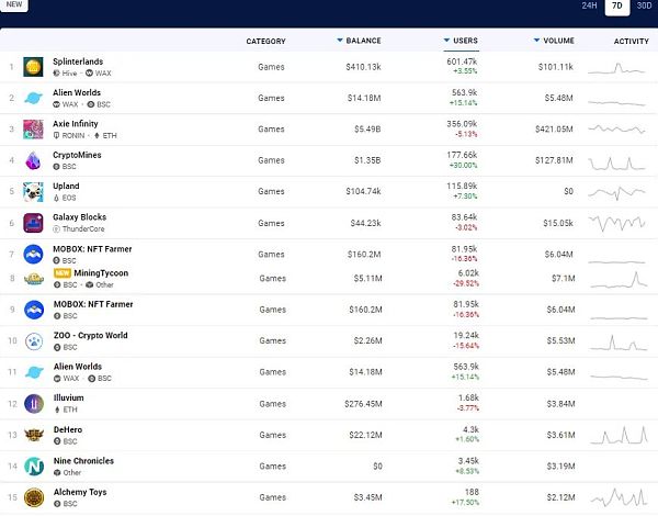 本周数据来源于Dappradar——专业的DeFi、Games、NFTs数据追踪分析平台。我们先带大家看一下本周项目。
