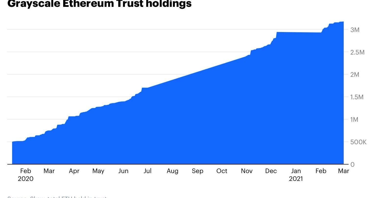 灰度以太坊信托持仓量另一个以太坊机构的敞口平台——芝加哥商品交易所期货最近上线,该平台首日交易金额就超过了3300万美元。2020年12月,位于康涅狄格州的对冲基金OneRiverAssetManagement公布承诺,“到2021年初,其持有的比特币和以太币将达到约10亿美元。”以太坊的发展情况