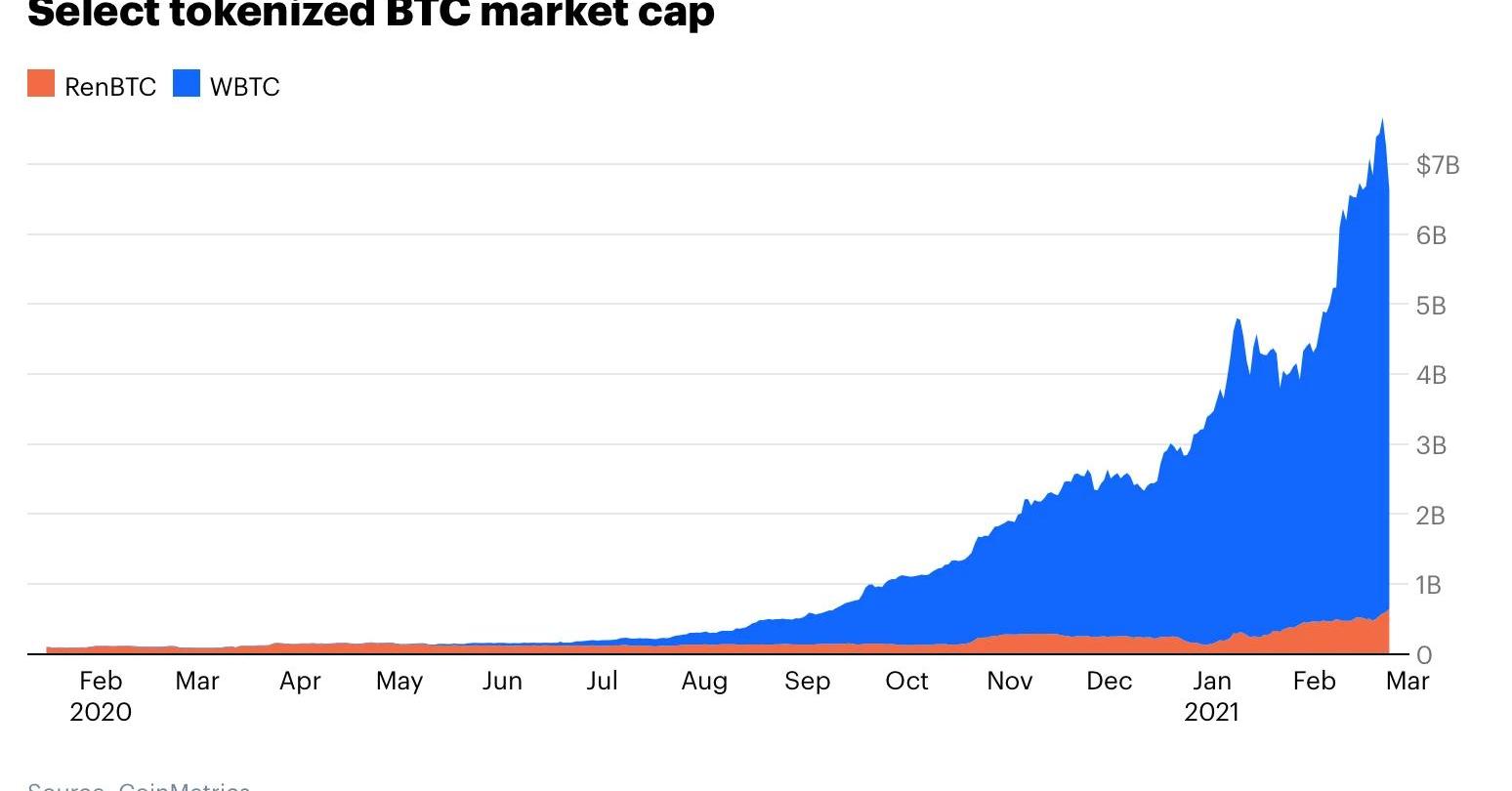以太坊稳定币的市值以太坊经济中一个规模较小但增长迅速的组成部分是“wrappedtoken”,它允许那些非以太坊原生加密货币在以太坊区块链上使用,并容易与DeFi应用程序交互。因此,代币化比特币的价值大幅上升。