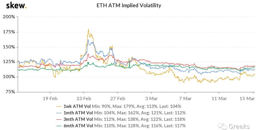 ETH历史波动率10d96%30d96%90d122%1Y94%以太坊今日期权成交量0.94亿美元,持仓量27亿美元。各标准化期限IV:今日:1m112%,3m118%,6m117%3/14:1m112%,3m118%,6m114%ETH的看涨期权比较受欢迎,总的来看以太坊目前不如比特币的主要原因是价值存储功能尚不强大。但是比特币被广泛接受后,以太坊被接受也只是时间问题。