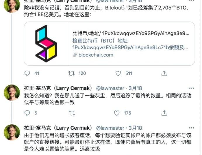 BitClout涉足影响力变现,但未经影响力价值所有人授权就替人发币的行为,或涉法律风险。在社交媒体上,仍有不少人表现出了对BitClout的兴趣。有加密资产用户认为,当某个人的影响力越来越大,他对应的代币价格就可能上涨,「用户们一起推动某个人出名,再从中获利,相当于把注意力变现了。」BitClout的白皮书上也点明了这一点:通常情况下,转发一个人不会给你任何好处。如果这个人因为你的推波助澜而成为超级明星,那么几年后他们能记住你的名字就已经很幸运了。相比之下,有了BitClout,你可以购买某人的币,然后转发他们,这就使得如果他们爆红,你不仅在经济上可以顺势而为,而且还可以获得吹嘘的权利。想象一下,能够说「我很早就转发了她」和能够说「我在她的币0.5美元的时候买了她的币,现在已经500美元了」这两者之间的区别。在Gang看来,利用加密资产玩起社交经济的Bitclout充满了趣味性。然而,需要注意的是,当下BitClout上充斥着不少假冒名人的账号和代币。由于任何人都可以在BitClout创建账户,且平台没有审查机制,导致各种冒名账号出现。3月20日,币圈大V神鱼在微博贴出了一个Bitclout上名为「bitfish1」的账户截图称,「假冒的真多,不是本人。」而当时该账号对应的名人币已经被炒到了871美元一枚。不仅冒牌账号可能走用户手里的真金白银,更有业内人士提醒,BitClout可能本身就是一个局。此前,TheBlock研究总监LarrtCermak在推特提醒用户远离BitClout。根据他的追踪,BitClout通过售卖BitClout币,已经筹集了2705枚BTC,约合1.55亿美元。3月22日,蜂巢财经查看该地址发现,BitClout募资的金额已经增加至2987.99枚BTC,约1.71亿美元。