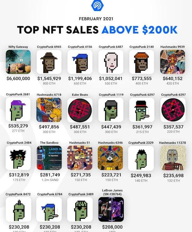 上图资料来源:DappradarNBATopShot、Hashmasks和CryptoPunks仍是最受关注的NFT项目,据称一幅Hashmask作品以420ETH的价格被售出,在过去30天内,Hashmasks作品销量始终保持在前三位,销售额超过3,300万美元。对于CryptoPunks来说,2月也是非凡的一个月,因为该项目创造了7900万美元的历史最高销售额。此外,CryptoPunk最低价格已经从2月初的10,000美元增加到40,000美元以上,目前平均销售价格约为32,000美元。