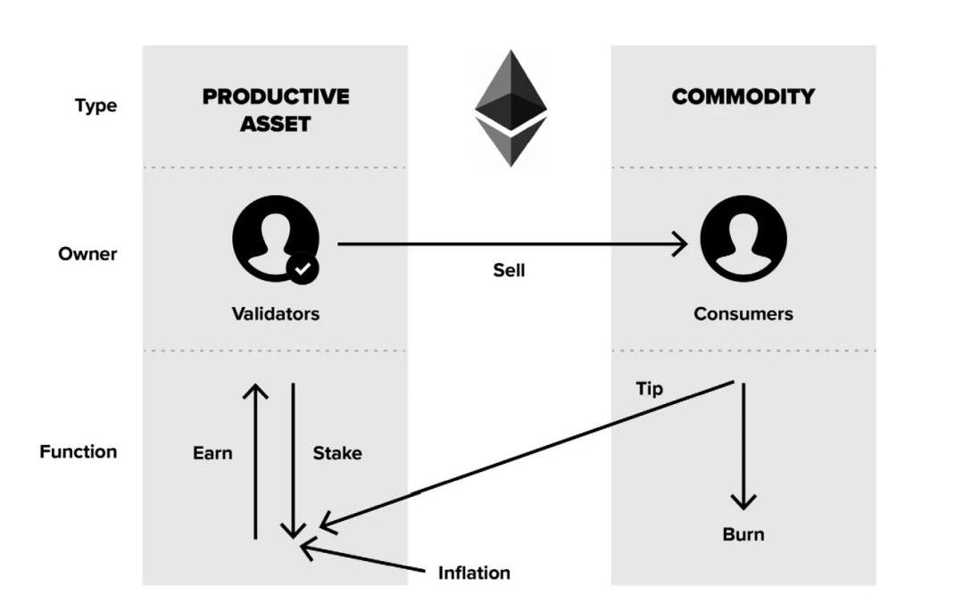 向以太坊2.0进发,征途正在进行。以太坊2.0目标是成为可扩展的PoS区块链。在当前以太坊上,矿工通过专门的矿机消耗电力挖矿,而以太坊2.0则让持有者可以抵押以太坊代币,成为网络中的验证人,参与其中获得来自交易费的一部分收益,以及来自以太坊网络增发的部分代币。(在EIP-1559提案中,可能会销毁手续费)思考ETH的价值,ETH2.0的关键变革也需要考虑其中。以太坊2.0下,ETH不再是单纯的消费商品,而是生产性商品--ETH的持币者可以抵押代币获得利息。这一资产结构,并不存在于物理世界之中。商品会被消耗,权益类证券则提供现金流的收益权。在以太坊2.0中,ETH则兼具了商品和股权的性质:可以作为商品被使用,也可以作为抵押品,获得现金流收益,类似权益类证券。ETH的初始价值来自于它的商品用途和动态变化的供求关系。那些对以太坊未来价格充满信心的投资者,可以抵押ETH以赚取收益,增加自己的持仓量。因为需要将ETH作为抵押物,这可能会进一步减少ETH的流通量。如果大量的ETH被抵押,可用于消费的代币量会减少,因此有可能形成以太坊价格的正反馈循环。下图展示了在以太坊2.0网络中价值的流通路径。请注意,具备完整功能的以太坊2.0网络何时才能上线,目前尚不知晓。