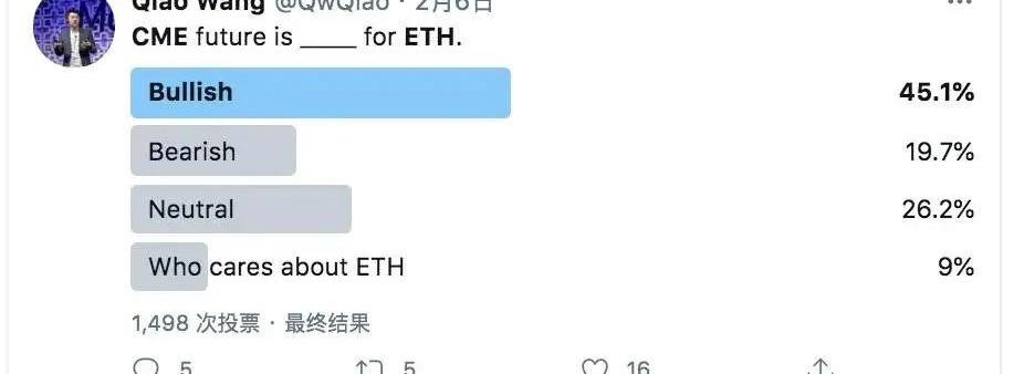 “机构正在购买ETH,而这才刚刚开始。”对此,DeFi投资人QiaoWang发起了一次意见投票,结果显示,有接近45%的投票者认为CME上线期货对ETH是有利的,仅有19.7%的人认为这是不利的。