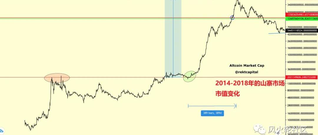 上图是除开比特币之外所有币种的市值随时间变化做成的月线图,自2014年到现在的一个长期趋势。这个图要自己观察的话在tradingview.com里面添加标的搜索:TOTAL2,就可以看到,TOTAL是包括比特币在内的加密市值K线,2是不包含比特市值的。从上图可以看到山寨市场的总市值才刚刚超过了2018年初5000亿美金的最高峰,这一轮比特已经是在超越2017年高度后又翻了一倍有余,我觉得对山寨市场的这个想象空间还是可以有的,特别是按山寨季的定义,是要有大量altcoin增长幅度超过比特币的。