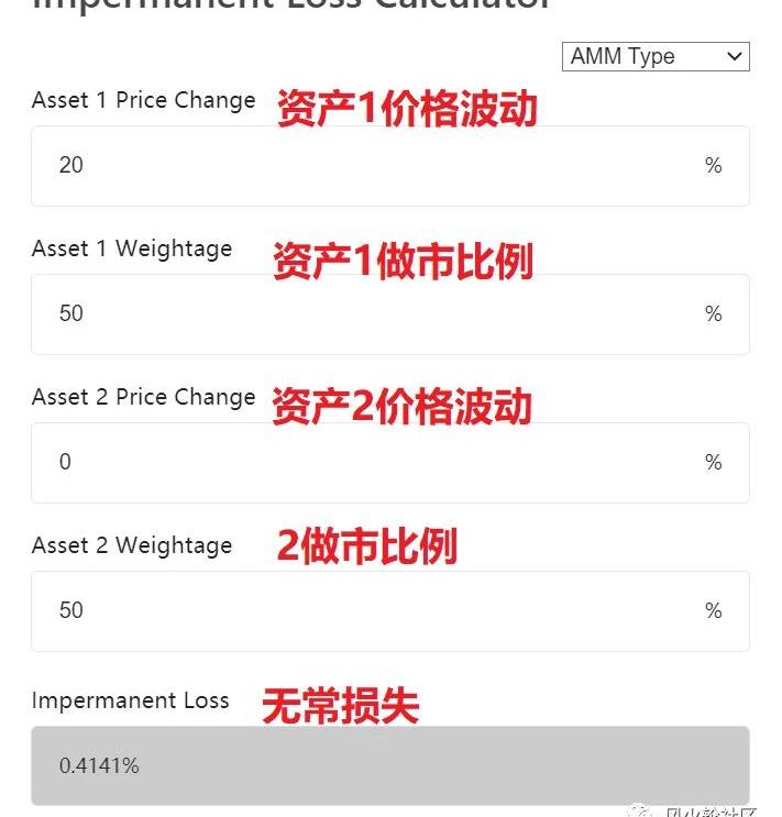 资产1和2按1:1配置时,当资产1价格波动20%,无常损失是0.4141%,但如果我们把价格波动的那份资产比例降低到20%,无常损失能减低到0.2753%: