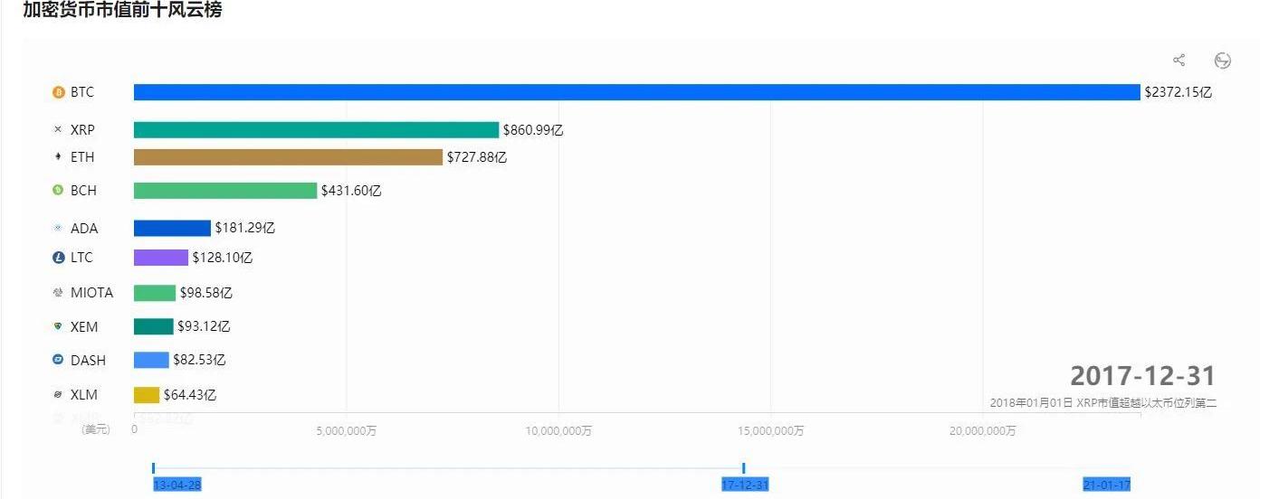 两轮牛市相比,这次市值TOP10之和增加4087亿美元,从5041亿美元到9128亿美元,涨幅81%。然而,市值上涨主要动力来自比特币,增加了4351亿美元,除它之外的9个山寨币都没有创下新高。这意味着,上一轮牛市高位接盘的投资者,大概率已成为时间的尘埃,只有购买比特币才能与时间做朋友。从宏观角度观察你会发现,当前加密数字货币总市值较2017年牛市顶峰8160亿美元,增加了2241亿美元。只是与此同时,山寨币总市值只有3425亿美元,较2017年巅峰市值缩水了2043亿美元。这说明啥?铁打的比特币,不低调有实力。山寨币的江湖,尸骨累累。不过,有一个无法忽略的事实:个别山寨币在牛市的表现确实优于主流币。前提是你能发现并拿住了。从六七千个数字货币里挑选已经是难事了,若要求有耐心持仓,我有点怀疑是故意为难人,毕竟大多数人的想法是“涨了赶紧抛掉”。投资者最怕的事情是啥?1、牛市来了,币没拿住;2、牛市来了,老酒一般的山寨币还在,钱没了。如果买错了,要不要止损?按照段永平的道理:只要把错的事情停止做了,就离“做对的事情”更近了一步。“做对的事情”其实就是发现是错的事情的时候要马上停止,不管多大的代价都是最小的代价。要不然,损失的机会成本更令人痛心。二XRP市值缩水85%
