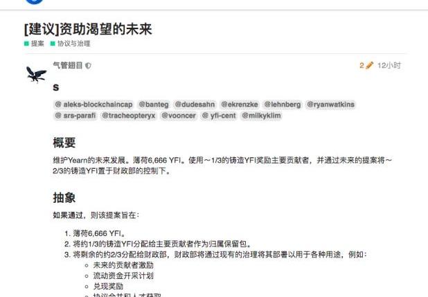 YFI社区关于增发YFI的提案当下,YFI发行总量为30000枚,且已全部分发,进入流通。作为公平分发Token的代表性DeFi协议,YFI当初坚持0私募、0预挖、0预留的原则,以保证Token公平分配给社区。而今,YFI社区的一些主要成员似乎意识到了弊端,特别是对核心贡献者缺乏足够的激励,使得社区人才有所流失,发展进度受阻。「提案旨在对此进行补救。」这则非正式提案提到,在创建一个权力下放的社区方面,YFI是杰出的,但它没有提供足够的激励措施来保留现有的以及将来的贡献者,也没有为协议提供资金来资助未来的活动。提案的一个重要观点是,此前的Token经济模型,导致了YFI处于竞争劣势。因为,其他主流的DeFi协议,都为贡献者保留了激励。根据统计,Uniswap、Aave、Synthetix、Compound、1inch、Curve和Balancer等项目为「贡献者」保留Token价值约3亿至21.3亿美元,占Token总量的20%~30%。其中,Uniswap团队拥有21.3%的Token,这为Uniswap团队提供了巨大的开发者聘用成本,也保持了未来运营支出的空间。而YFI的主要社区成员认为,YFI的贡献者没有公平地获得奖励,也没有充足的资金用于资助未来的活动,因此YFI难以与市场其他平台提供的薪酬方案竞争,导致了一些贡献者被其他项目挖走。所以,他们希望通过增发Token来消除人才的「竞争劣势」。提案提到,选择增发YFI的数量为6666枚,是因为这是目前30000YFI总供应量的22%,与多数「同行」相符。提案发起者表示,整体上这个方案将使YFI收益,有助于保留现有的贡献者并激励新的贡献者加入,同时将「国库资金」提升至与同行相当的规模,能够更好地支持YFI的业务增长。「增发」有通胀之险「不增」留不住人