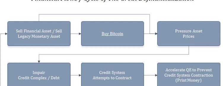 首当其冲的会是那些明显估价过高的金融资产,比如负利率的主权债务,但其实别的东西也没啥不同,排着队看是谁先完蛋而已。等到趋势逆转的时候,非比特币资产的价格会面临下跌压力,然后这些资产所支撑的债务工具也会面临下跌压力。对信贷的需求会大幅下降,使得信贷系统收缩。而这又会反过来加速对量化宽松的需求,以维持和吹胀信贷市场,然后进一步推动价值从金融资产出逃到比特币。去金融化的过程会自我持续和加速,因为金融资产价格、信贷系统和量化宽松所组成的反馈循环。