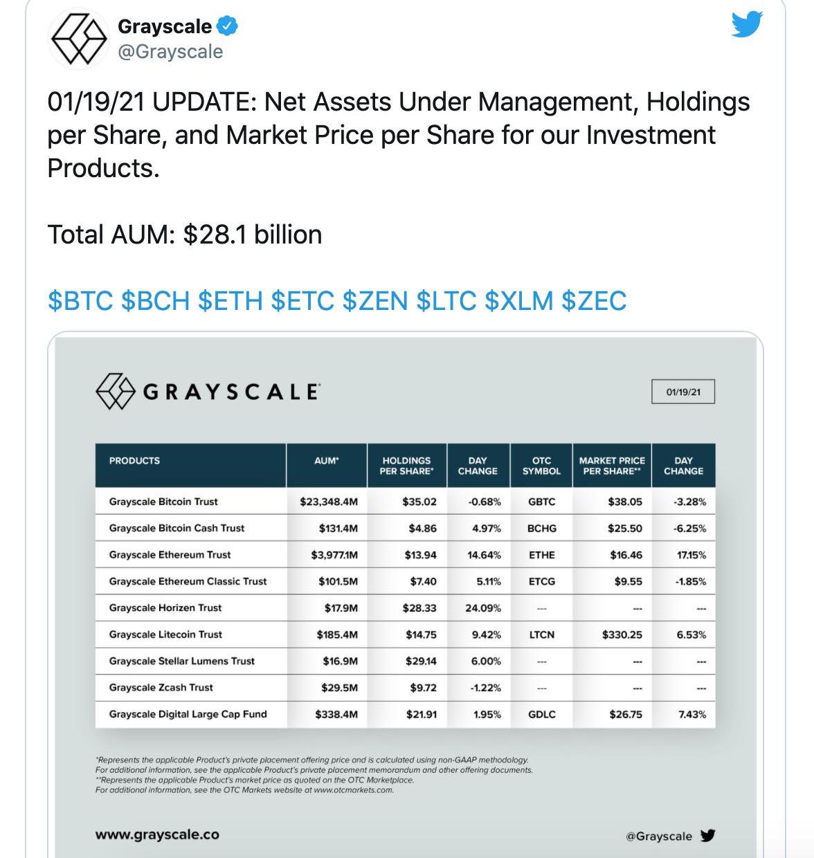 编者按:本文来自Cointelegraph中文,作者:SAMBOURGI,Odaily星球日报经授权转载。灰度新上任的首席执行官MichaelSonnenshein认为,随着机构资本和国家对数字资产的采用将推动下一轮牛市,2021年将是数字资产投资又一个关键年份。在今年虚拟CFCSt.Moritz大会上的主题演讲中,Sonnenshein指出了三个关键投资主题,这些主题支撑了2020年比特币的飙升。它们是投资BTC的传奇投资者和知名公司以及不断加强的数字资产监管框架。Sonnenshein认为,随着更多投资者投资比特币和其他数字资产,这一趋势将在2021年得以延续。他还指出了几家可能在不久的将来影响数字货币市场发展的公司。Sonnenshein认为,2021年投资者应该关注的六大主题是:与数字资产投资相关的职业风险降低金融顾问的兴趣日益浓厚北美和清洁能源加密挖矿的增长增加稳定币集成国家对数字资产的采用新的监管发展关于国家的采用,Sonnenshein推测,这可能包括中央银行数字货币的试点,以及比特币作为一些政府的战略储备的可能性。关于矿工,他表示,灰度的姐妹公司Foundry已经成为北美最大的加密货币矿商。灰度和Foundry背后的公司数字货币集团去年透露,它将投资1亿美元在北美挖比特币和其他数字资产。灰度的投资产品已成为采用数字资产的风向标。该公司管理的资产规模从2020年初的20亿美元猛增到年底的200亿美元。这一增长势头尚未减弱,截至1月19日,资产管理市场总额已达到281亿美元。2021年1月19日更新:我们投资产品的管理净资产,每股持股和每股市场价格。总资产管理规模:281亿美元$BTC$BCH$ETH$ETC$ZEN$LTC$XLM$ZEC—Grayscale2021年1月19日