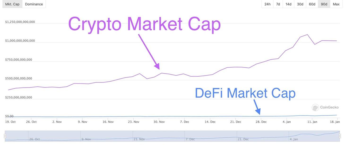 “如果你继续透过“比特币”和“竞争币”的镜头看加密世界,你会被抛在后面。现在是2020年,不是2015年。今天有:1、加密资本资产2、加密商品3、加密货币”当然,我同意这个观点,这是看待这个行业的正确方式。我还希望,2021年能为我们带来对这些资产类别的进一步理解。但是……带着资金进入加密资产领域的新玩家们,他们并不理解这些区别,他们不像Bankless的读者那样了解情况,他们并不是加密土著,而是加密新手。这是不可避免的,但行业将被新的投资者所淹没,他们徘徊在黑暗中试图找到自己的方式。这些细微差别超出了大多数人的认知范围,基于这些原因,我们仍将经历“山寨季”,而这个术语用来描述人们追逐低市值代币10倍涨幅的时期。但这一次,不会是对L1的投机。BTC和ETH已经赢得了那场比赛,而下一场竞赛可能就是以太坊的应用层。正如我们所说,投机将发生在应用层,也就是DeFi代币,而在当前,这些资产在整个加密市场当中,仍是一个极为被低估的组成部分。