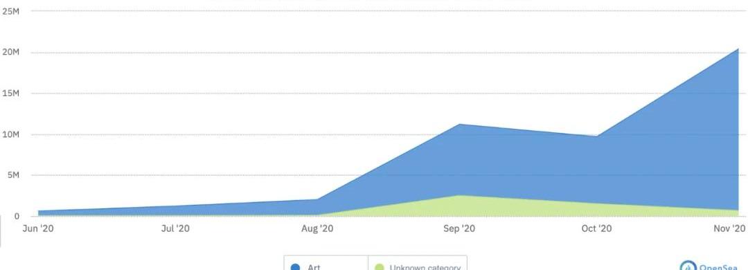 虽然今天大多数的区块链应用都只跟投机有关,但NFT艺术市场不同,它是真实的。光是2020年下半年,艺术品NFT以及用户创作内容的交易量就从每个月100万美元增长到超过2000万美元。6个月时间,20倍的增长!