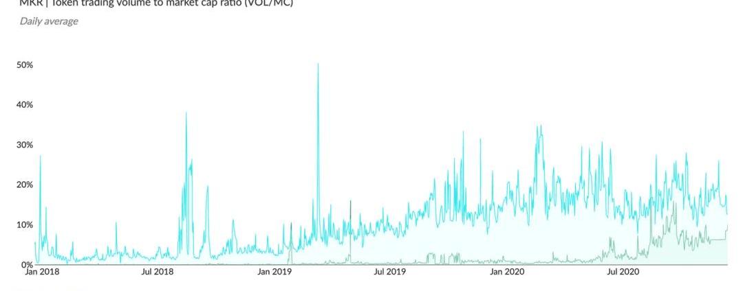 MKR|代币交易量与市值之比(VOL/MC)4.总价值锁定(TVL)--有多少资金存入项目的智能合约?计算方式为存入项目智能合约的流动资金或存入资产与借入资产的差额。