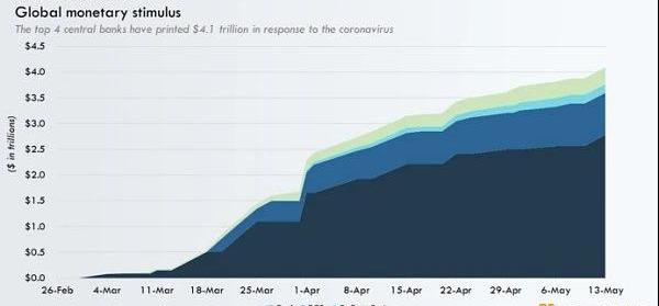各国央行开始大规模增发。到4月底,4大央行在7周之内增发货币价值超过3.5万亿美元。人们都在讨论无限量QE,0利率和现代货币理论。这暗示了BTC潜在的对抗通胀表现。